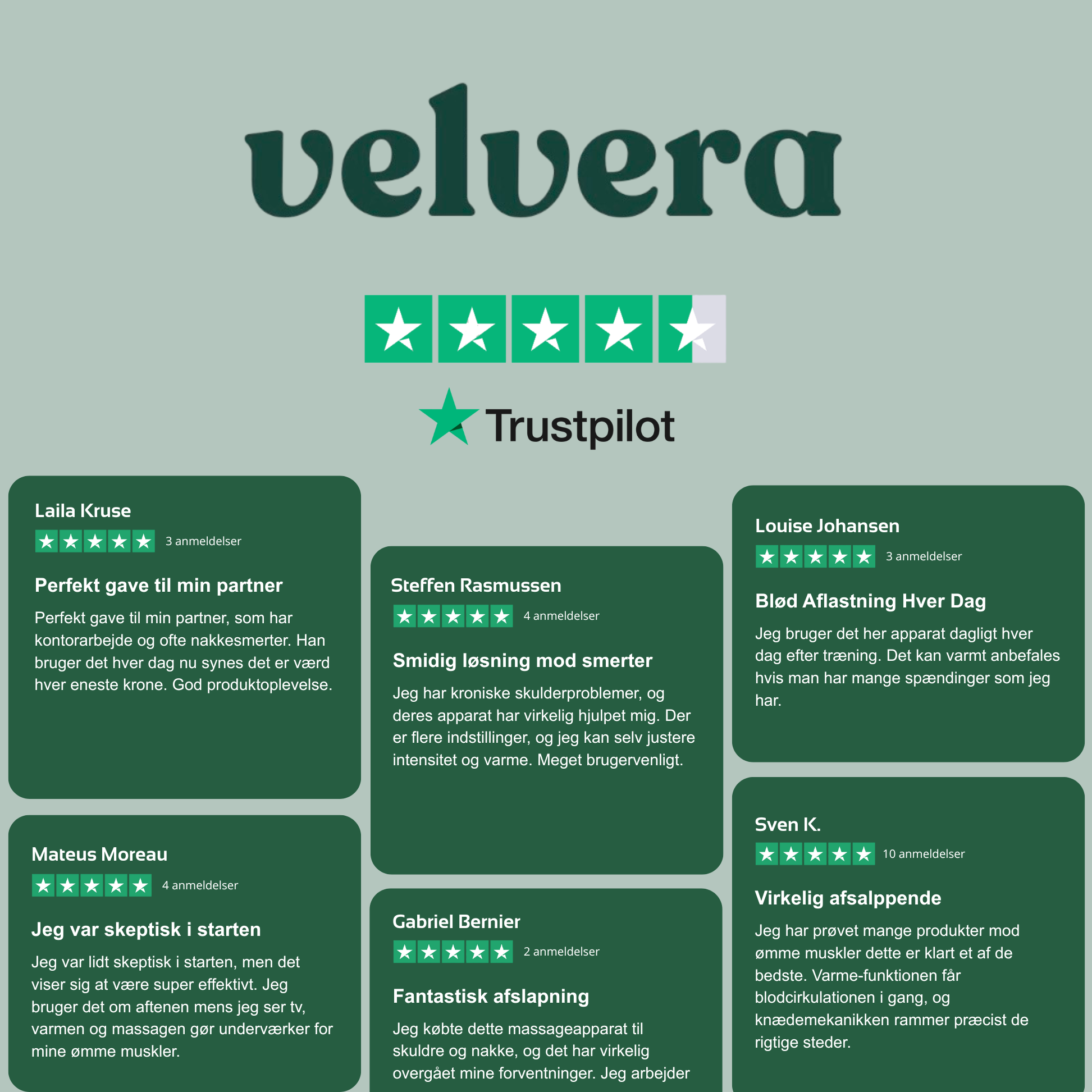 Uanset om du døjer med nakke-, ryg- eller skulderspændinger, leverer Velvera 2.0™ målrettet massage og varme, præcis hvor du har brug for det. Din nye hverdag starter med afslapning.